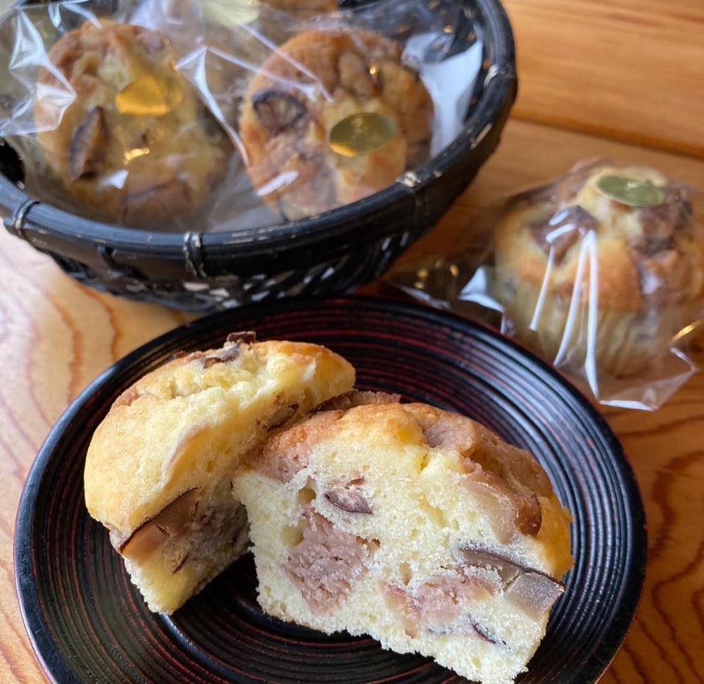 自家製の和栗の渋皮煮と、栗チョコと生クリームで作った栗チョコガナッシュをプレーンのマフィン生地に散りばめて焼き上げました!(1個300円)
